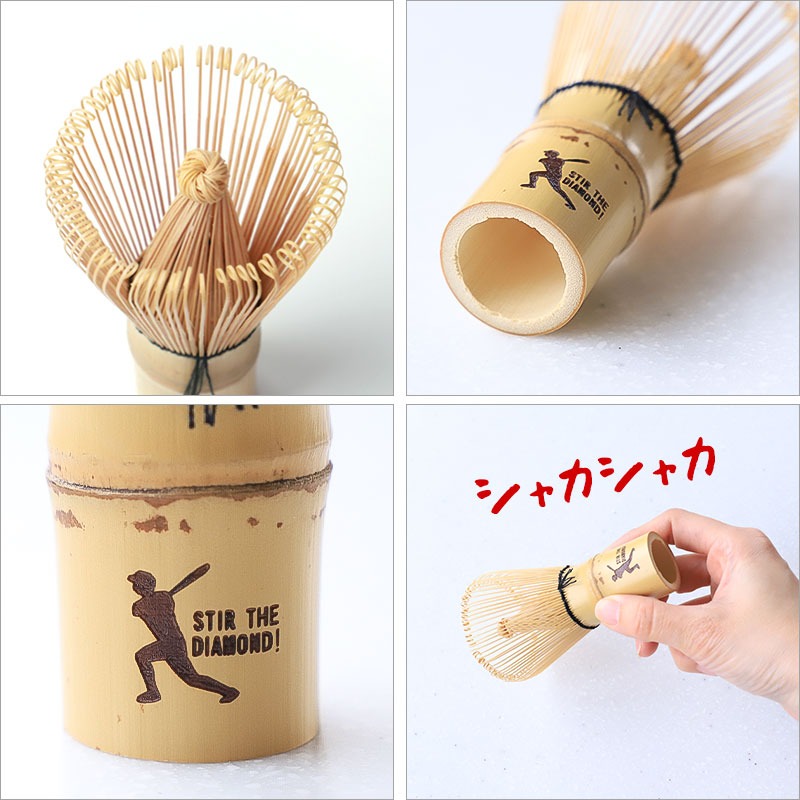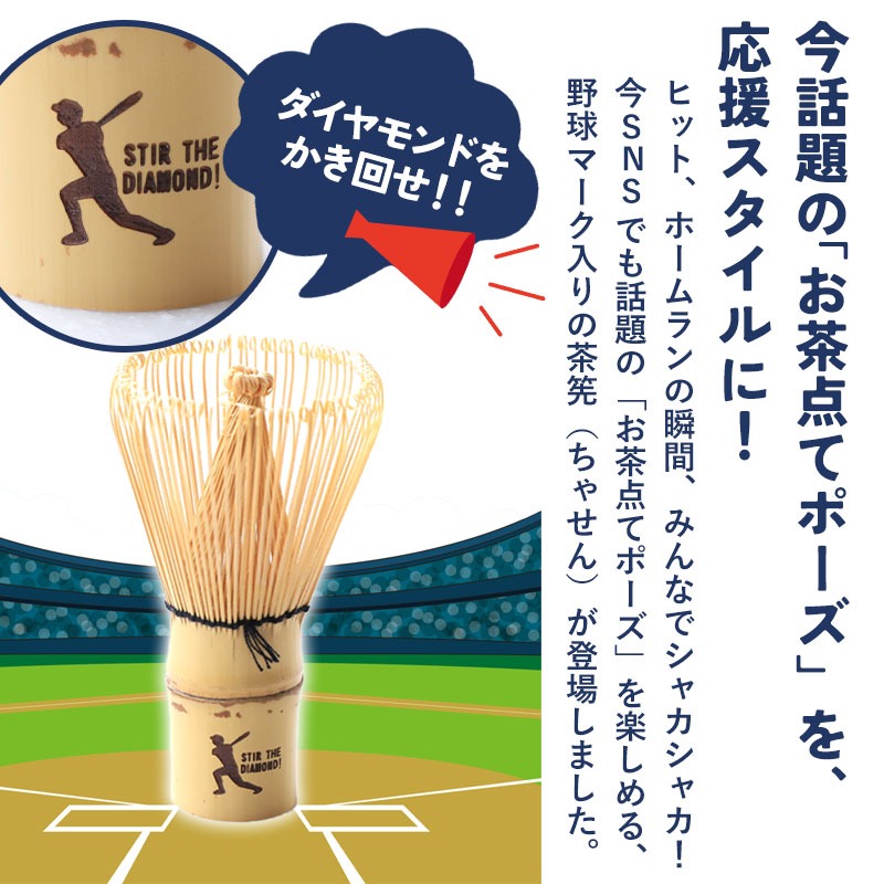茶筅は本来、抹茶を点てるための茶道具ですが、本商品では竹製の茶筅に野球をイメージしたワンポイントマークをデザイン。抹茶を点てる道具としてだけでなく、観戦時の応援グッズとしても楽しめる遊び心のあるアイテムとなっています。